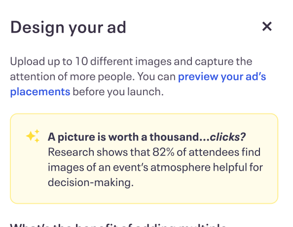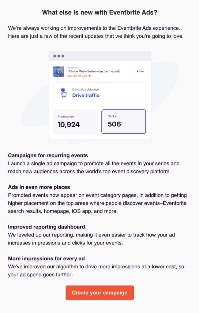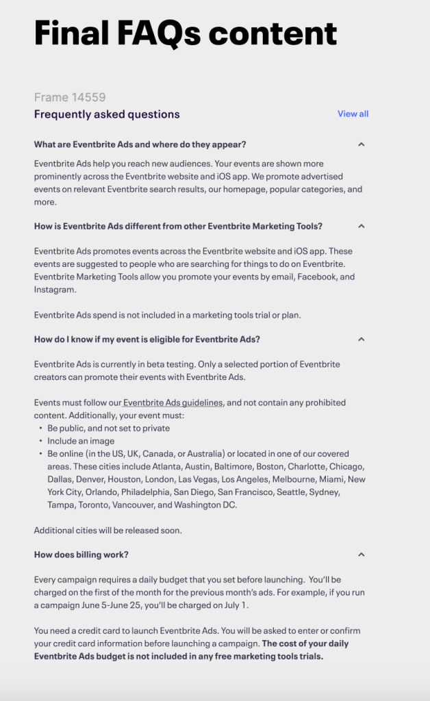 My biggest project at Eventbrite was creating and managing all content for Eventbrite Ads. Some of the content I owned included: