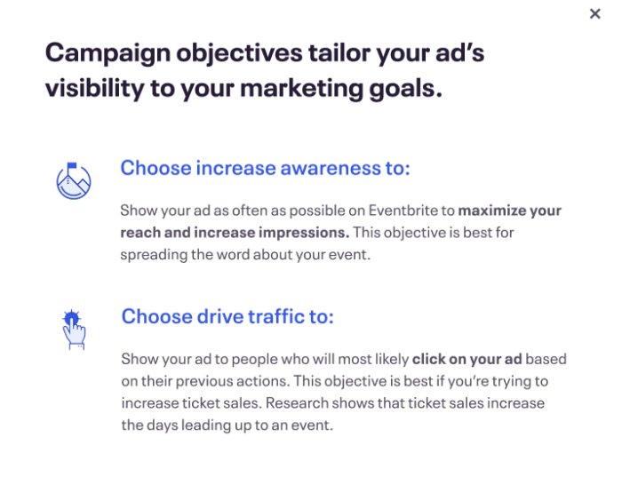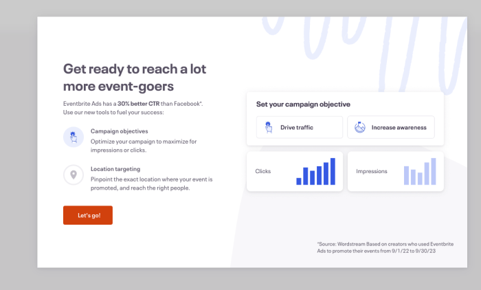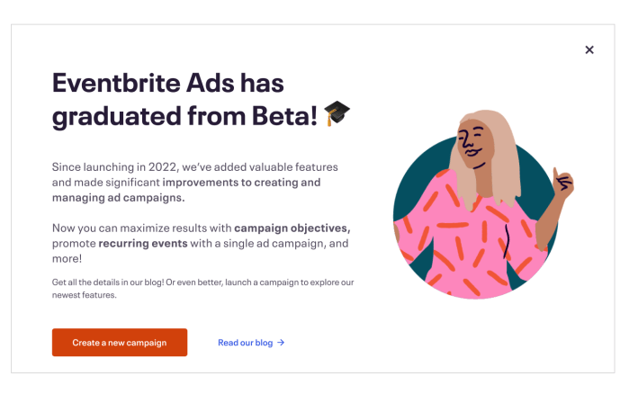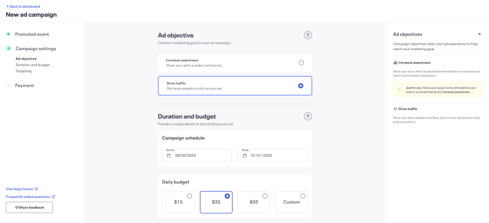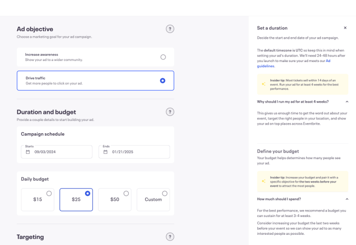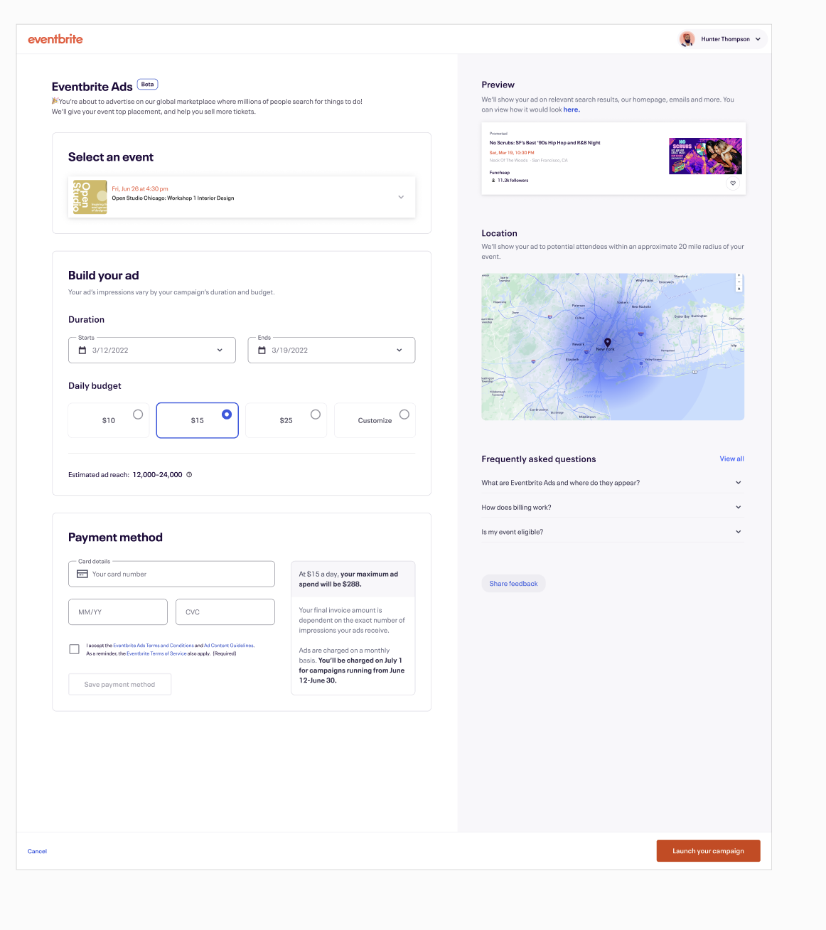 I created and managed the Beta version of Eventbrite Ads. The original campaign creation flow was simple and basic.